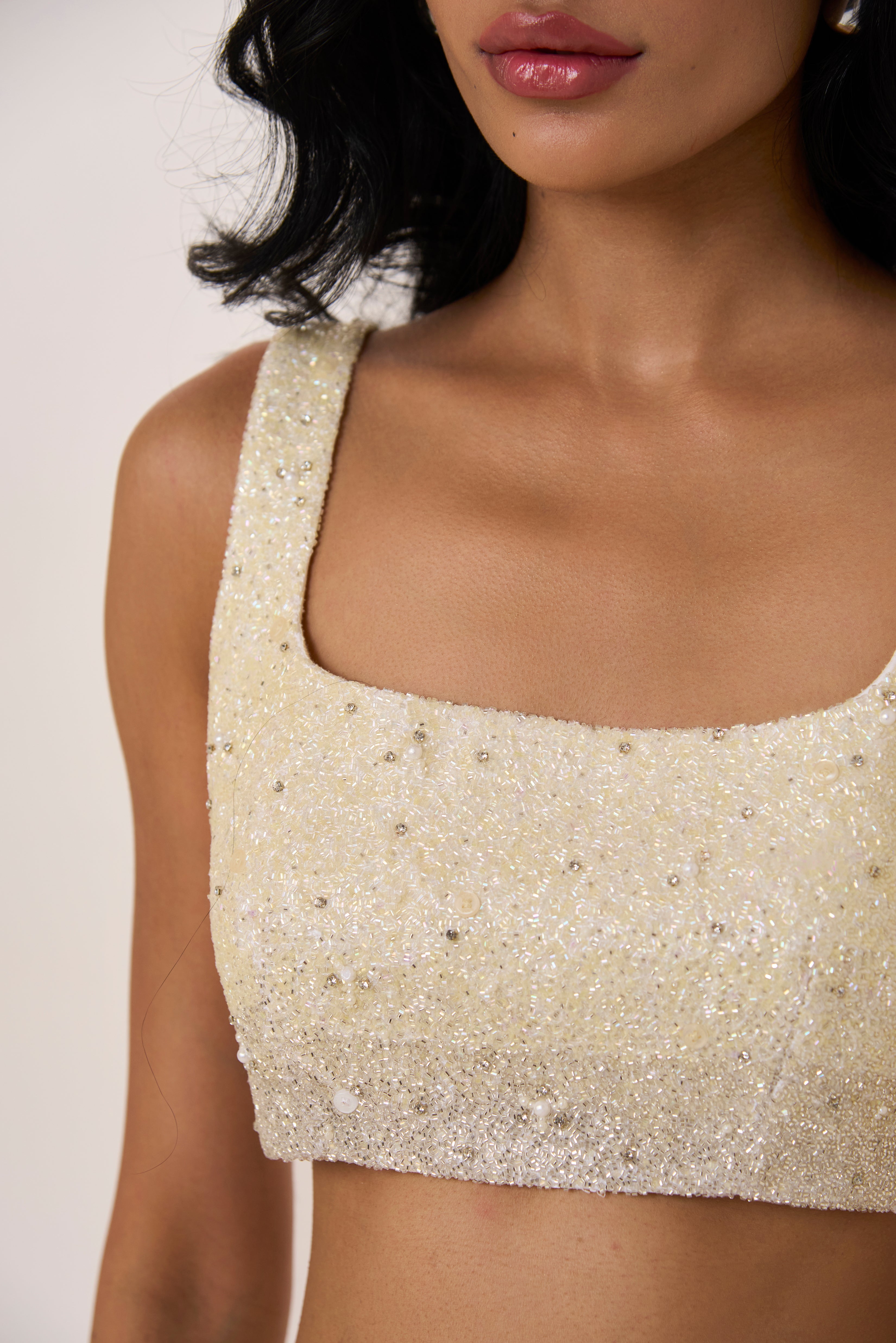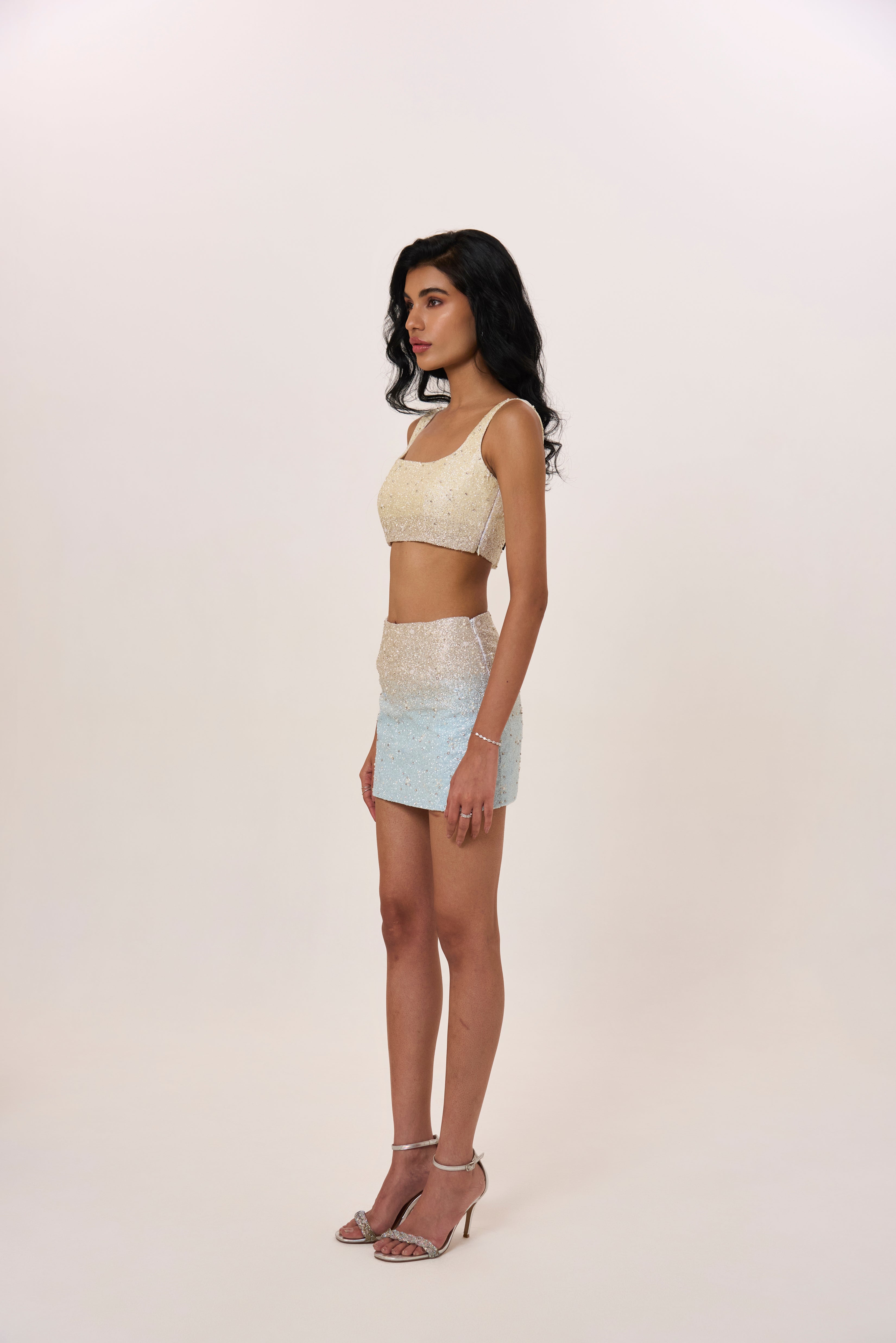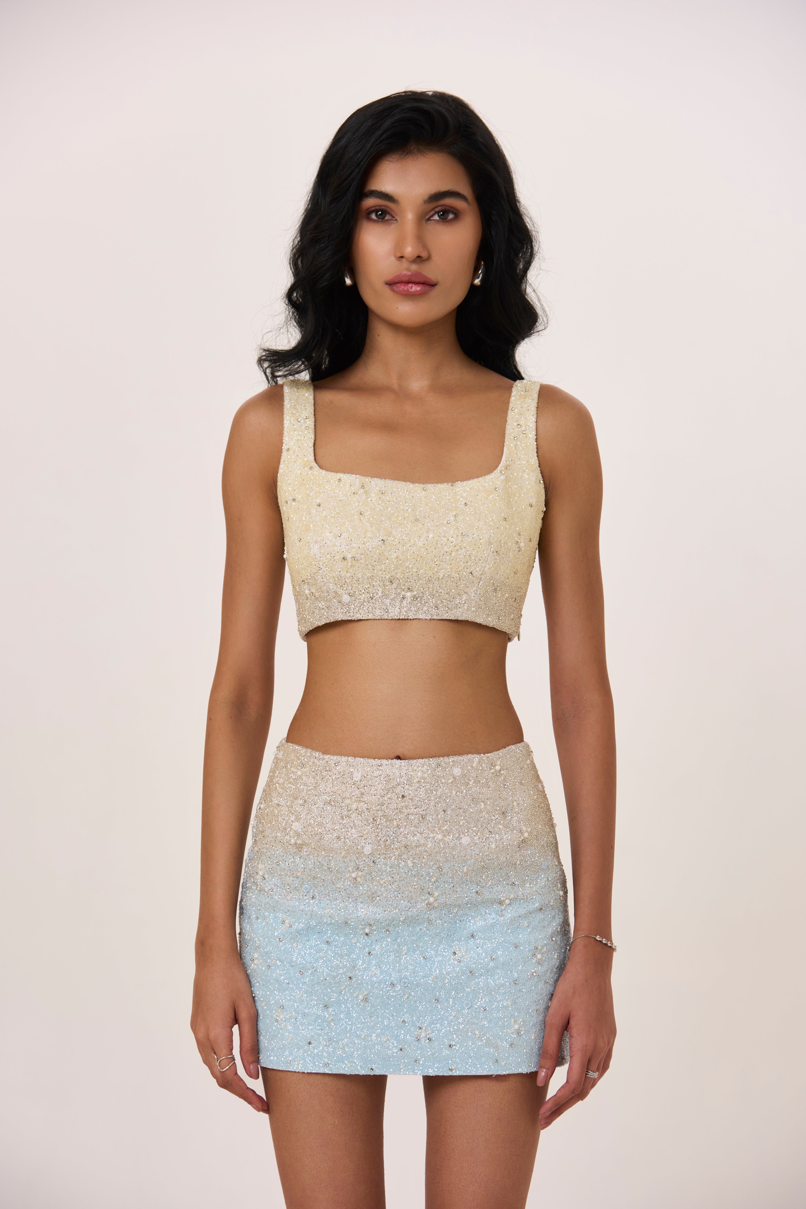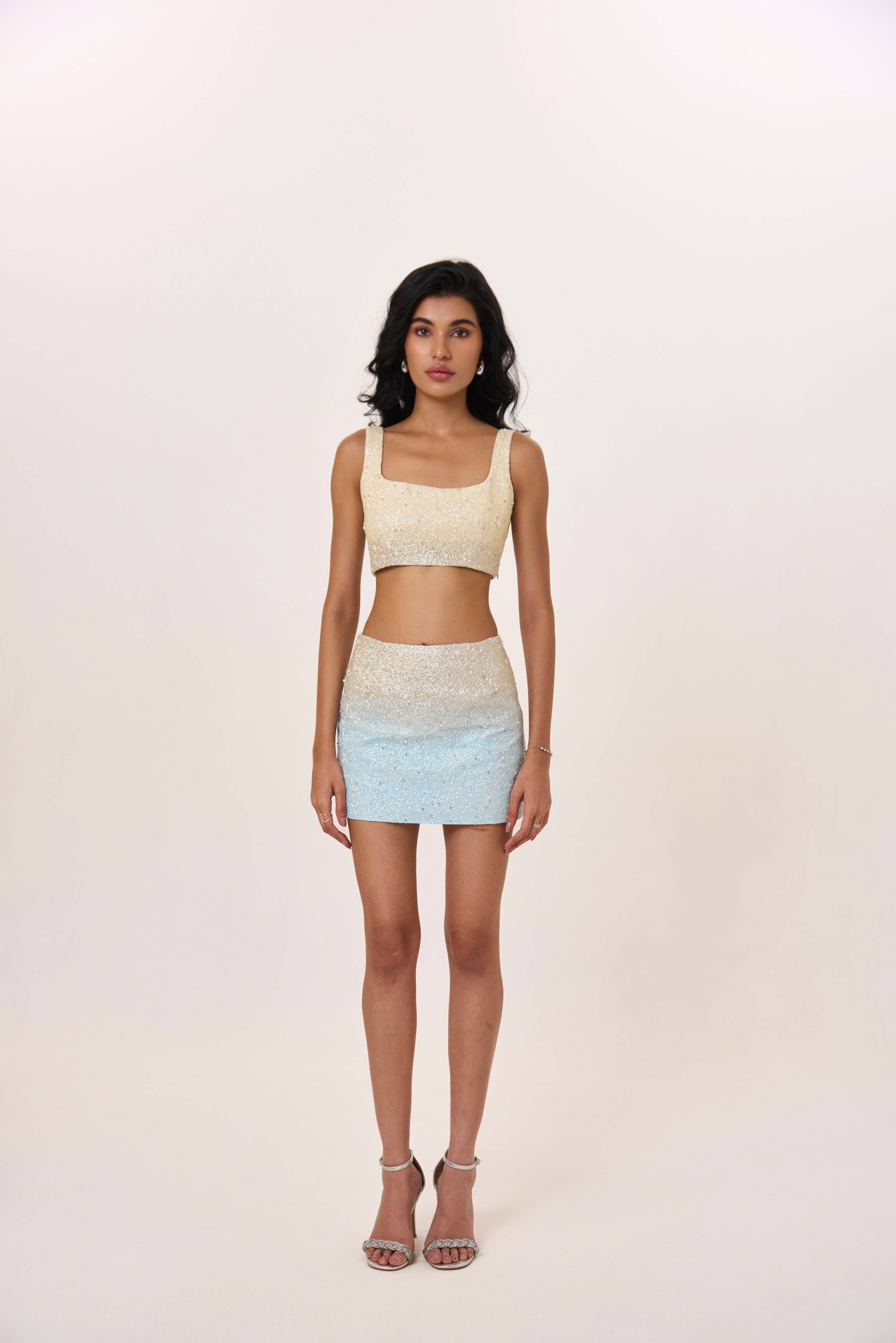 The Amber top and skirt set is a heavily hand-embroidered ensemble featuring cut beads and shiny stones arranged in a dense-to-light scatter for a shaded ombré effect. The top features a clean square neckline with matching detailing, while the skirt continues the ombré embroidery for a cohesive, striking finish.