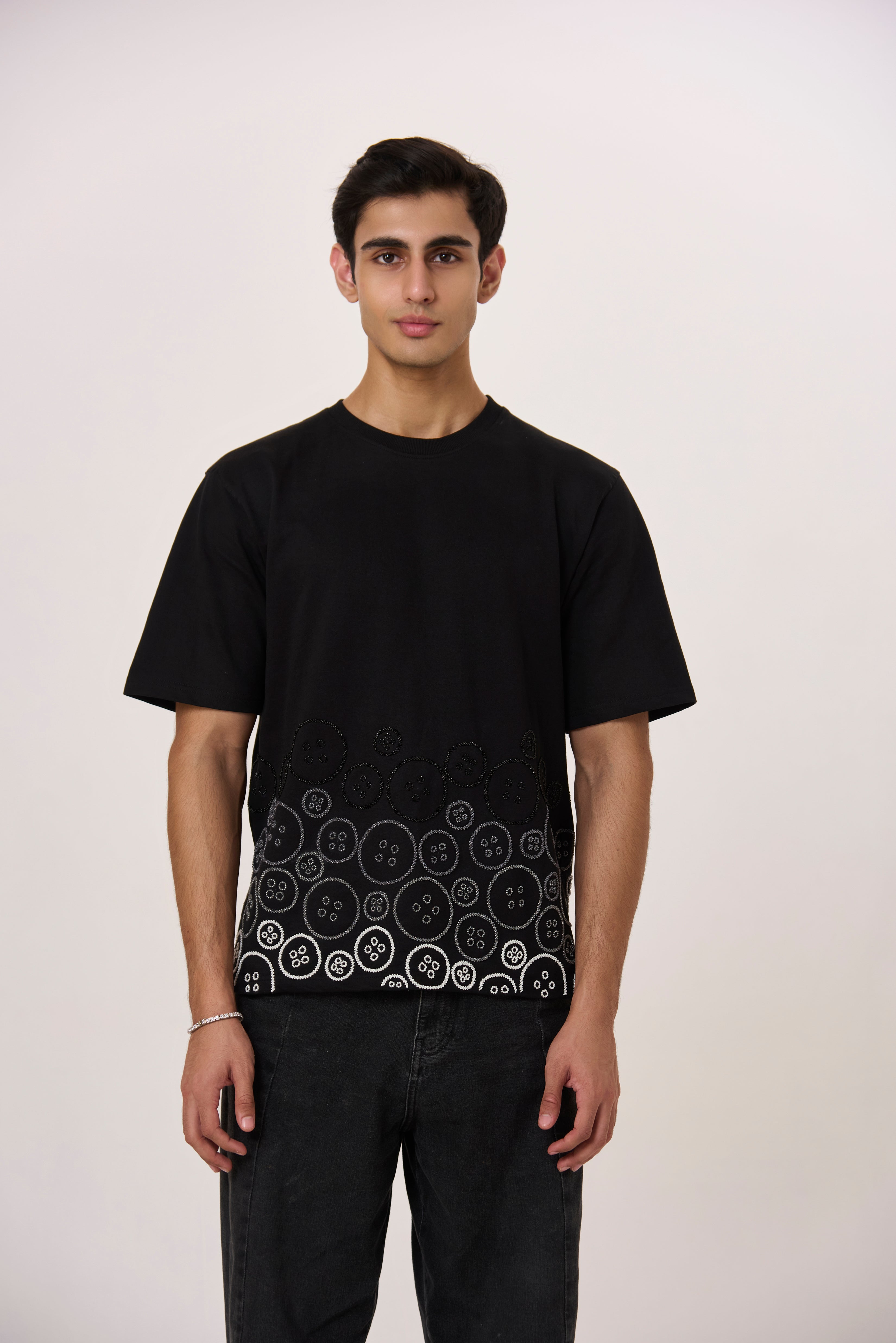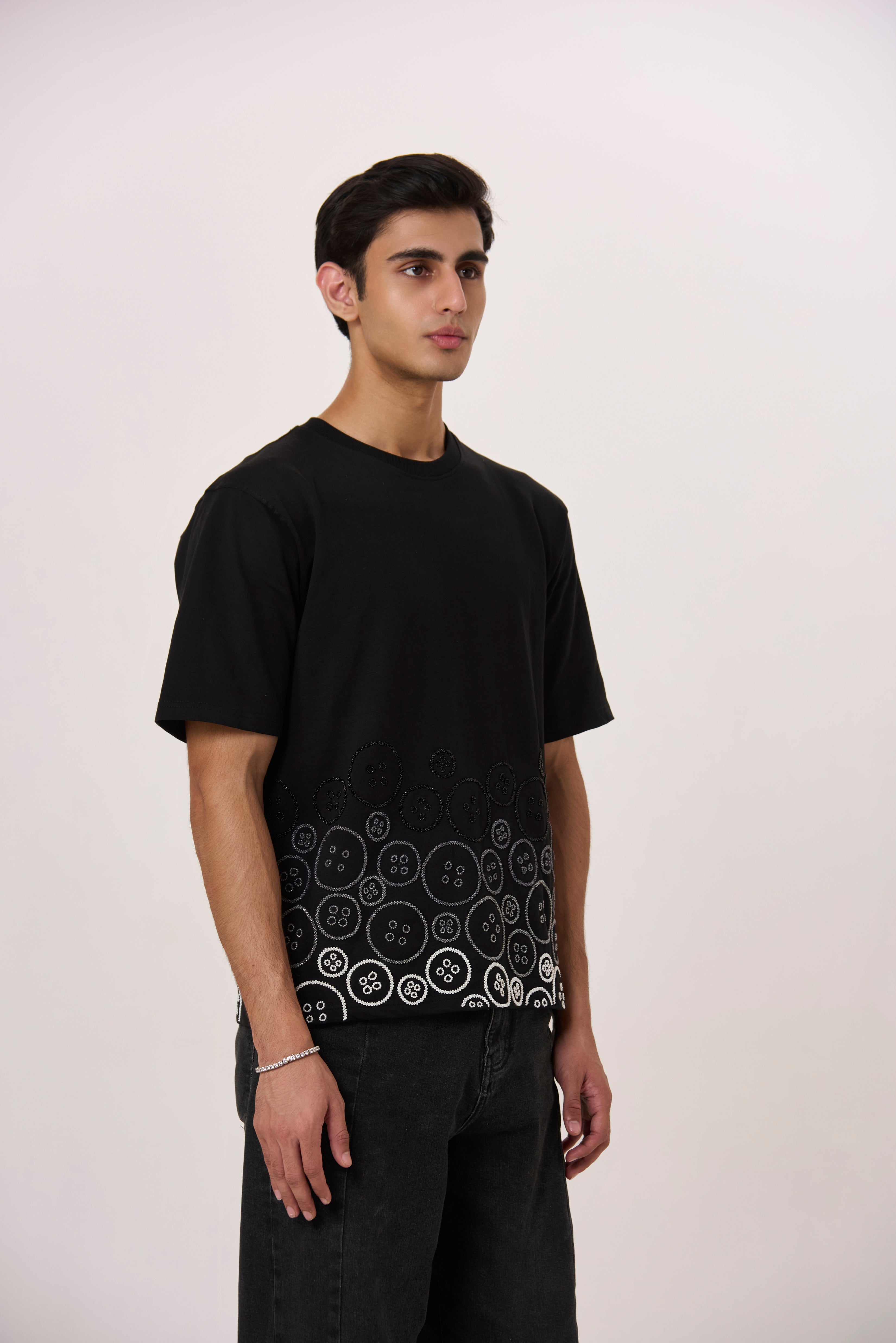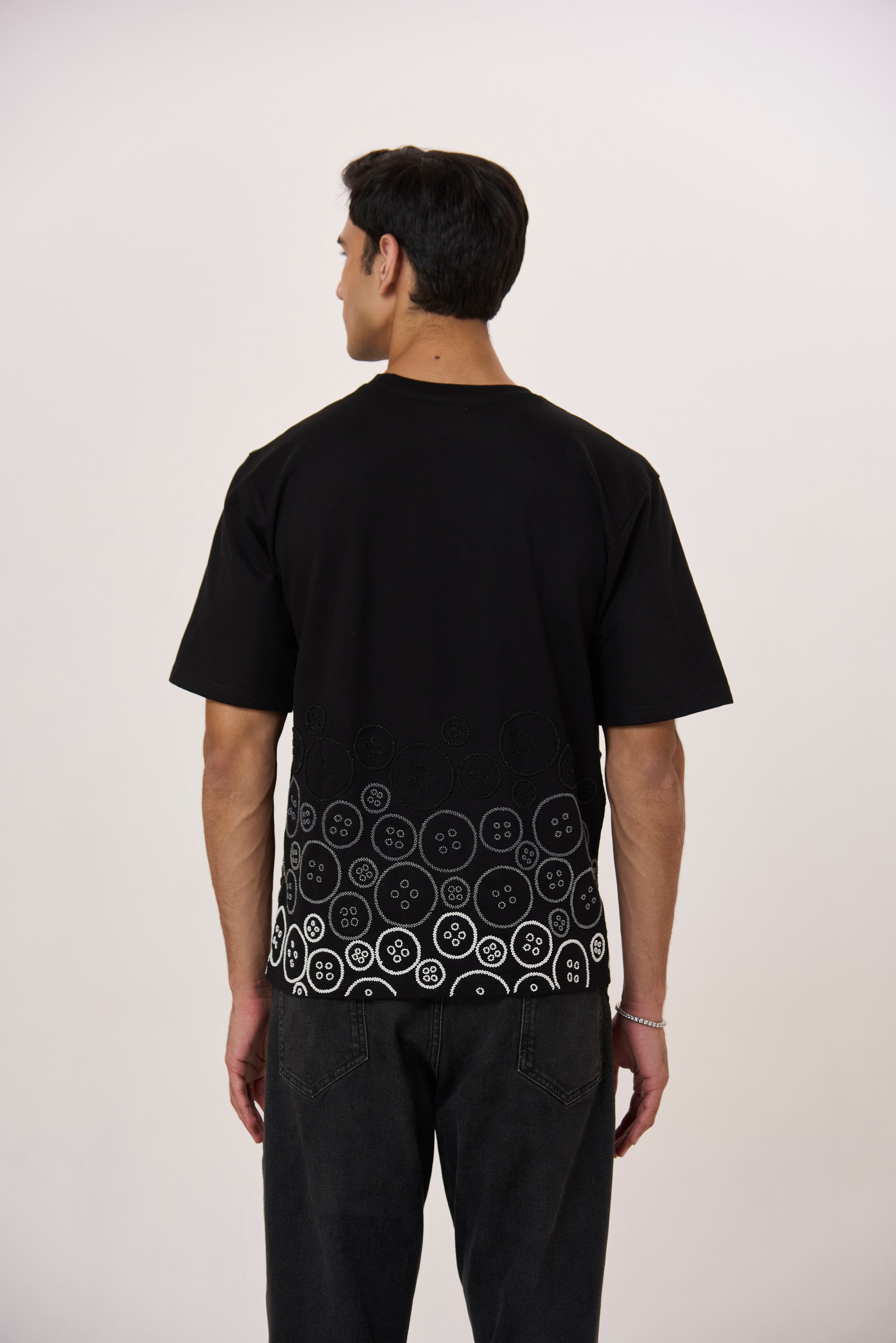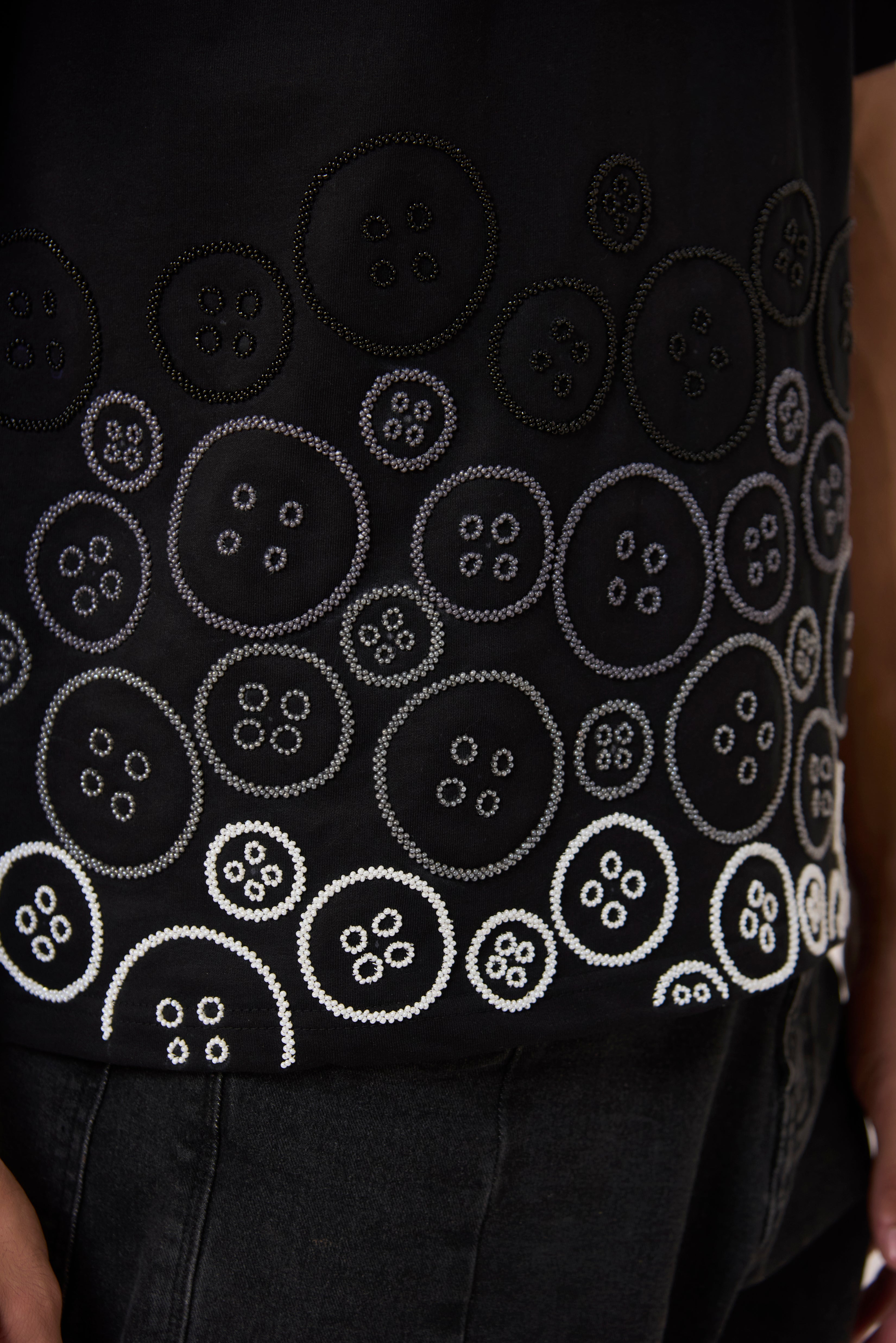 Our unisex relaxed fit cotton blend t-shirt thoughtfully embellished in our signature button motifs of different shades creating an ambre, a sophisticated day to night luxe choice.