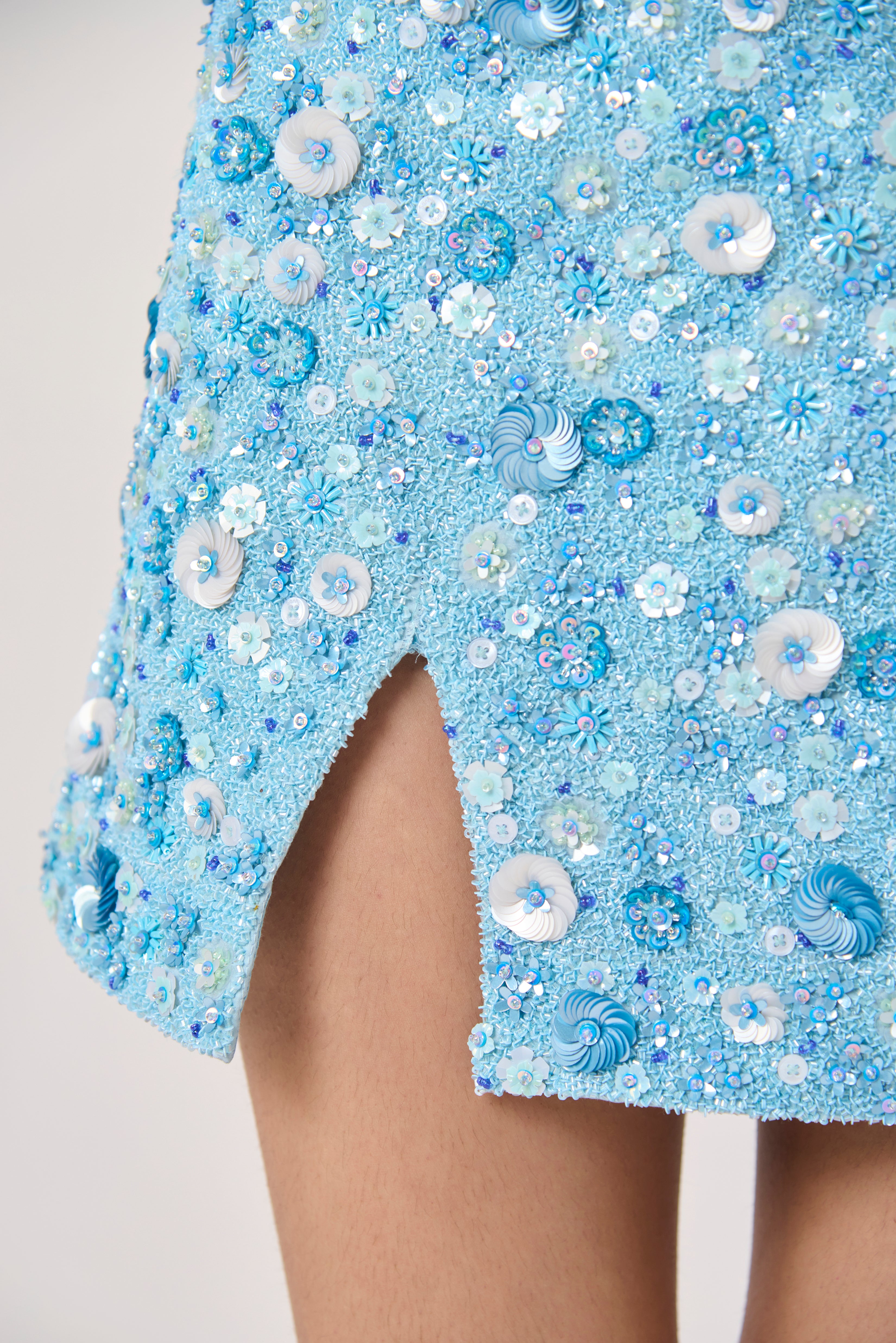 Celeste is a mini dress with a tailored silhouette that hugs in all the right places with a slit at the hem. This hand embroidery is a celebration of florals and finesse, with intricate sequins and beads arranged to form various flower patterns.