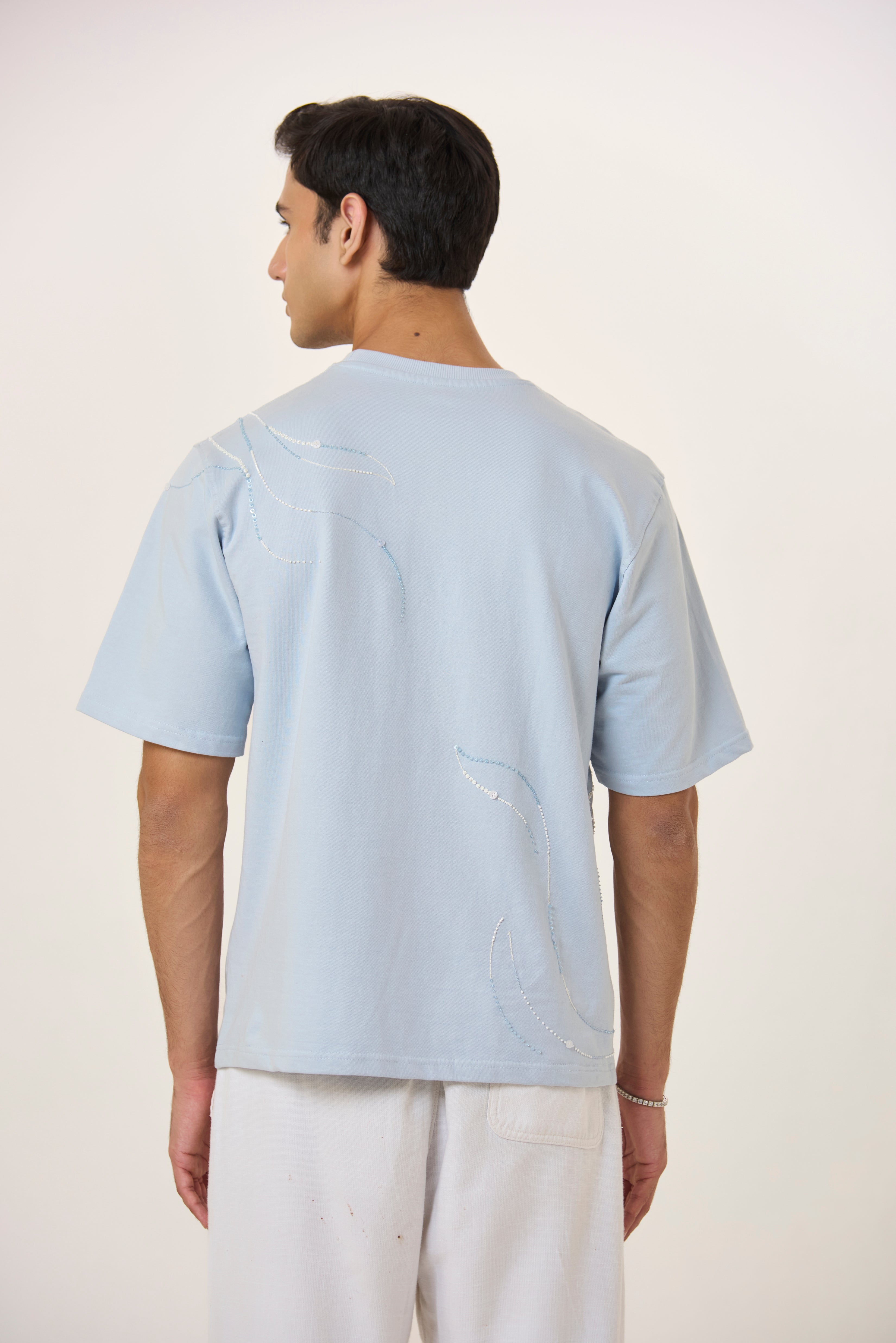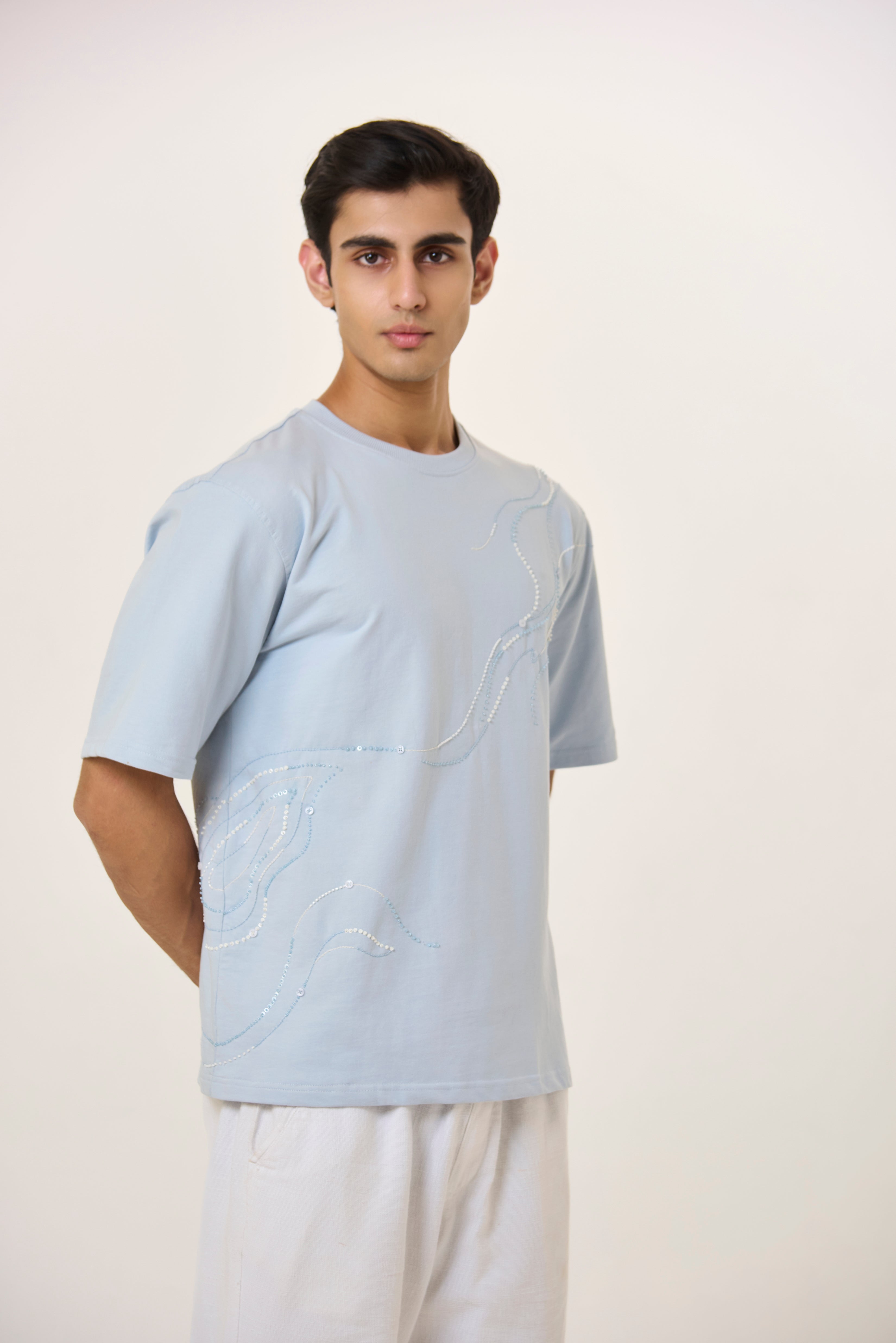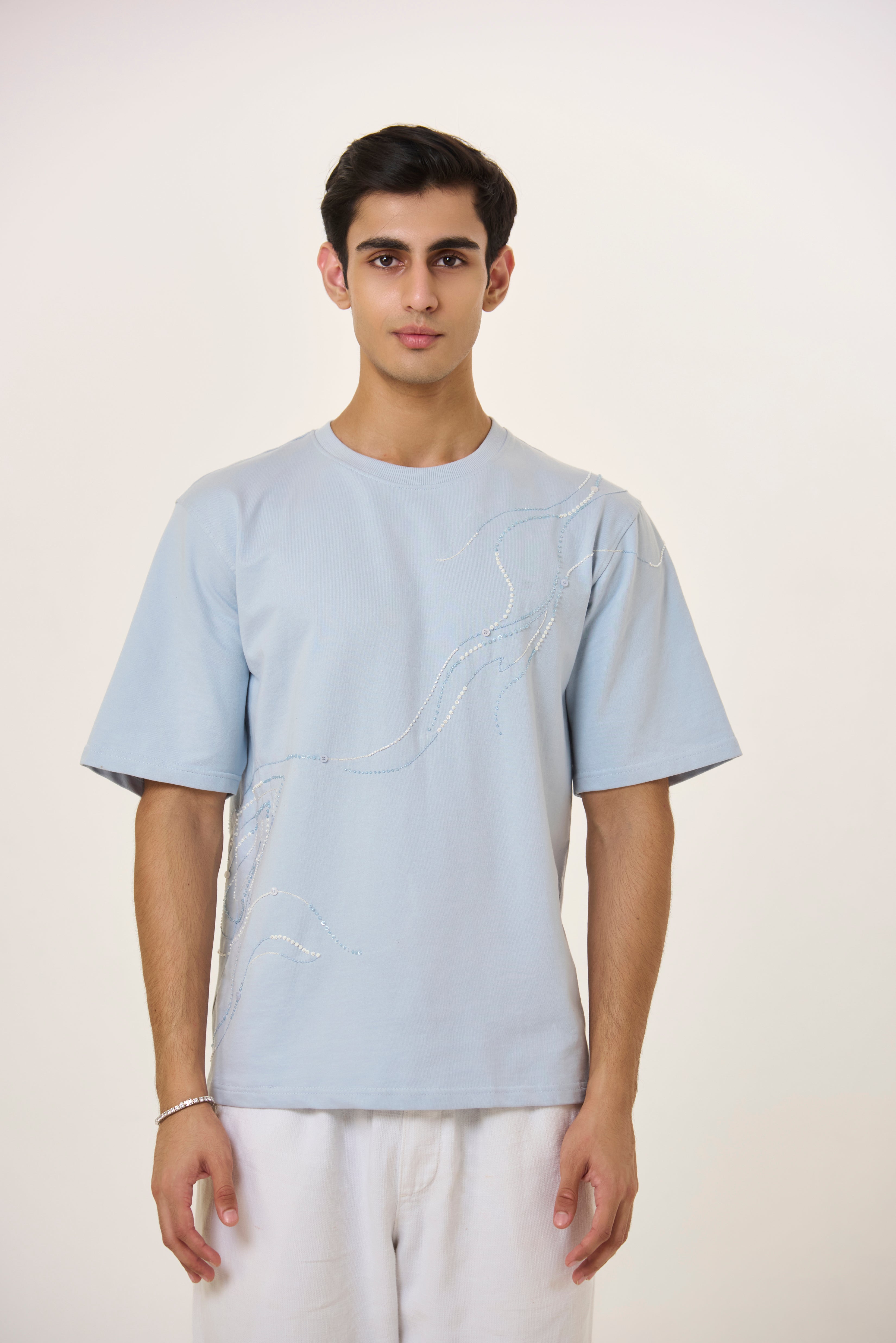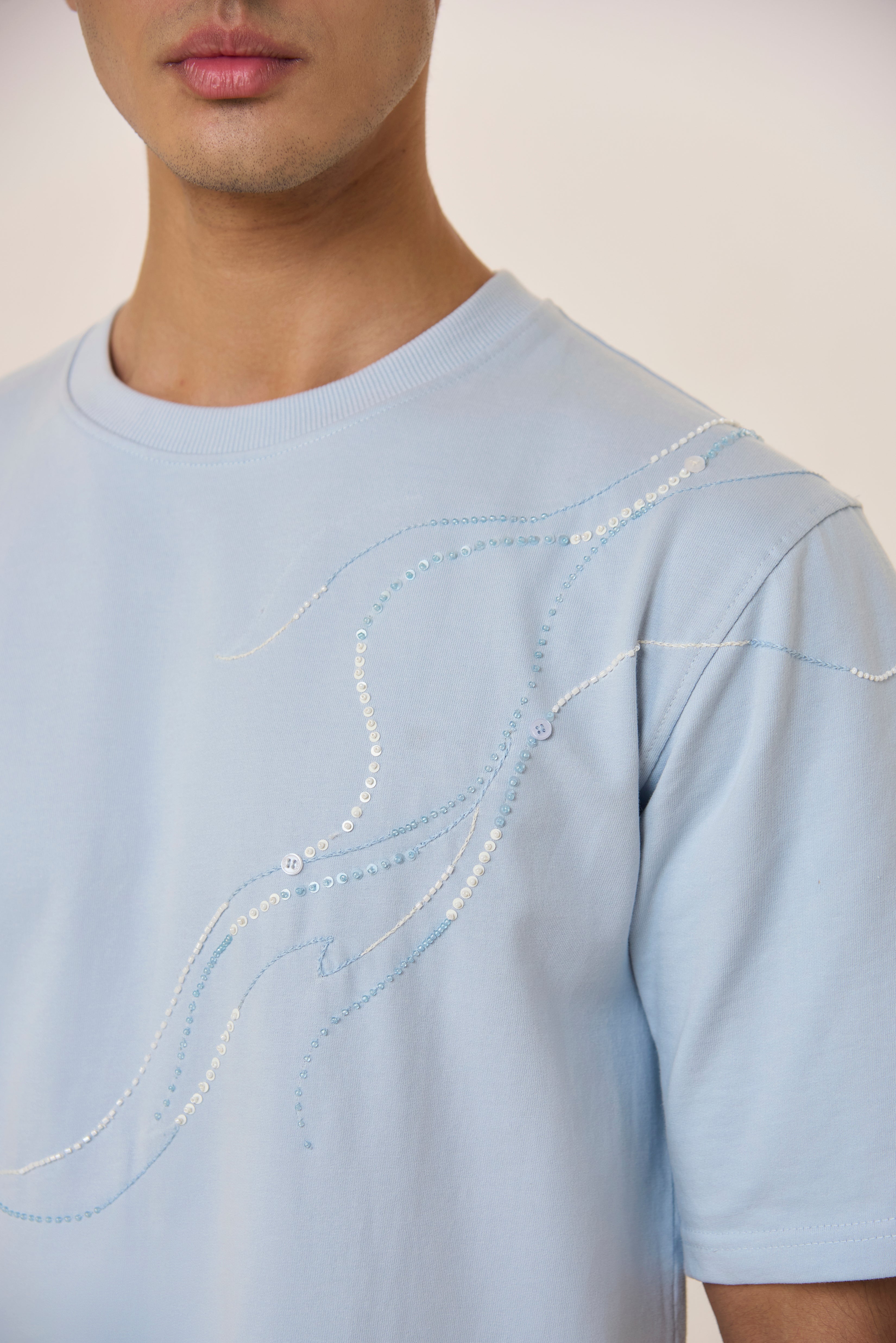 Our unisex relaxed fit cotton blend t-shirt elevated with an abstract and edgy motif that moves along the body through front and back with the signature button detail, defines the new modern luxe.