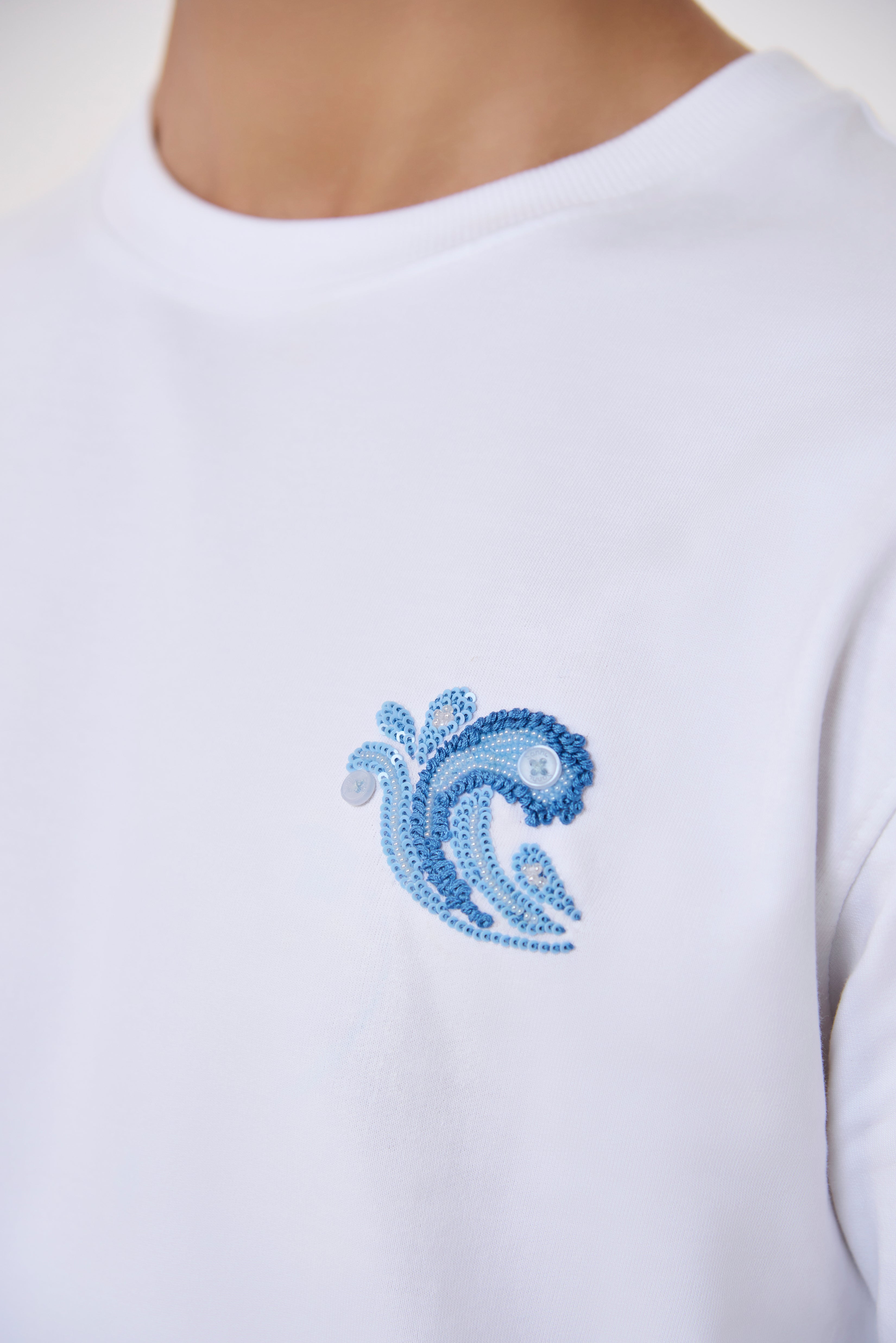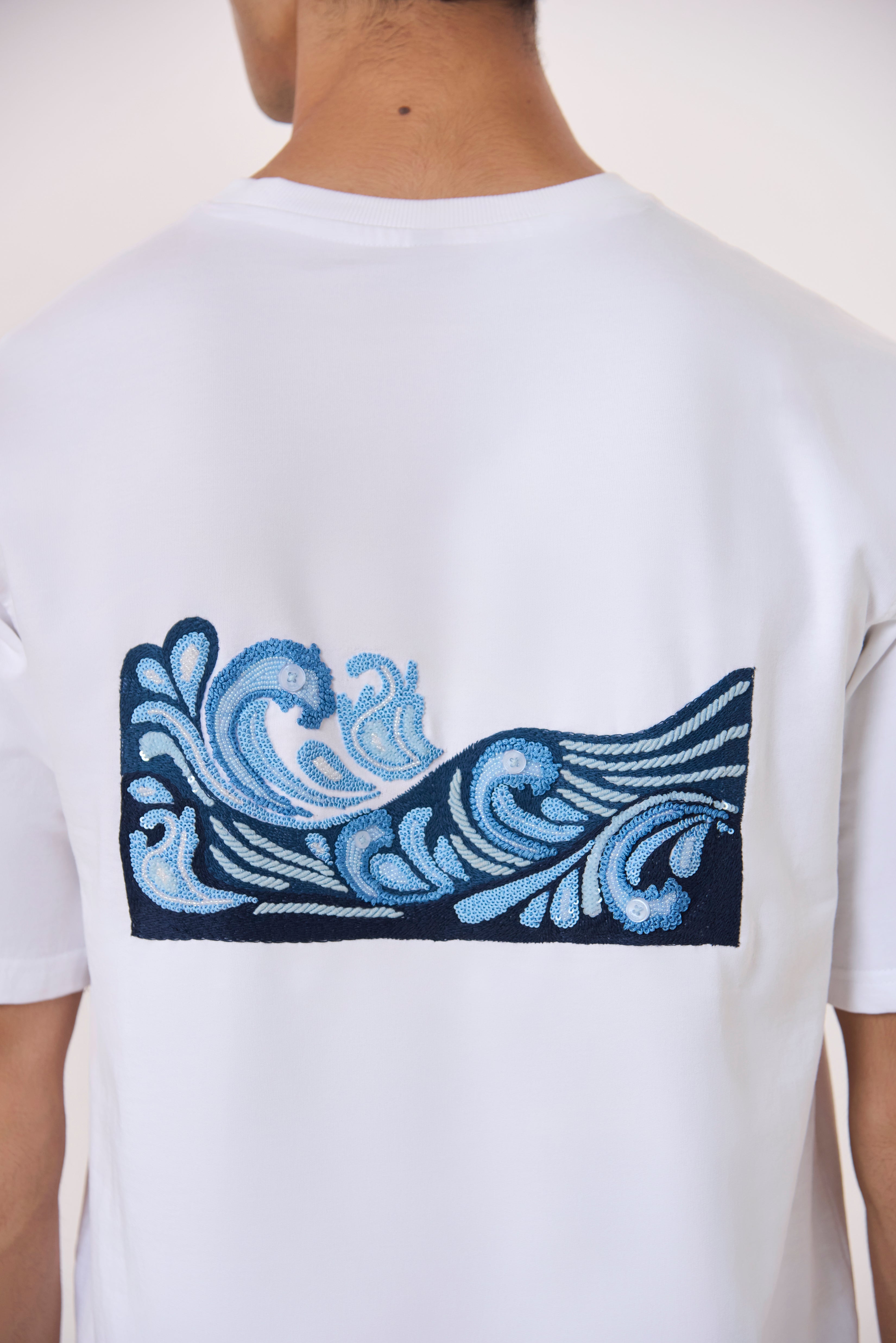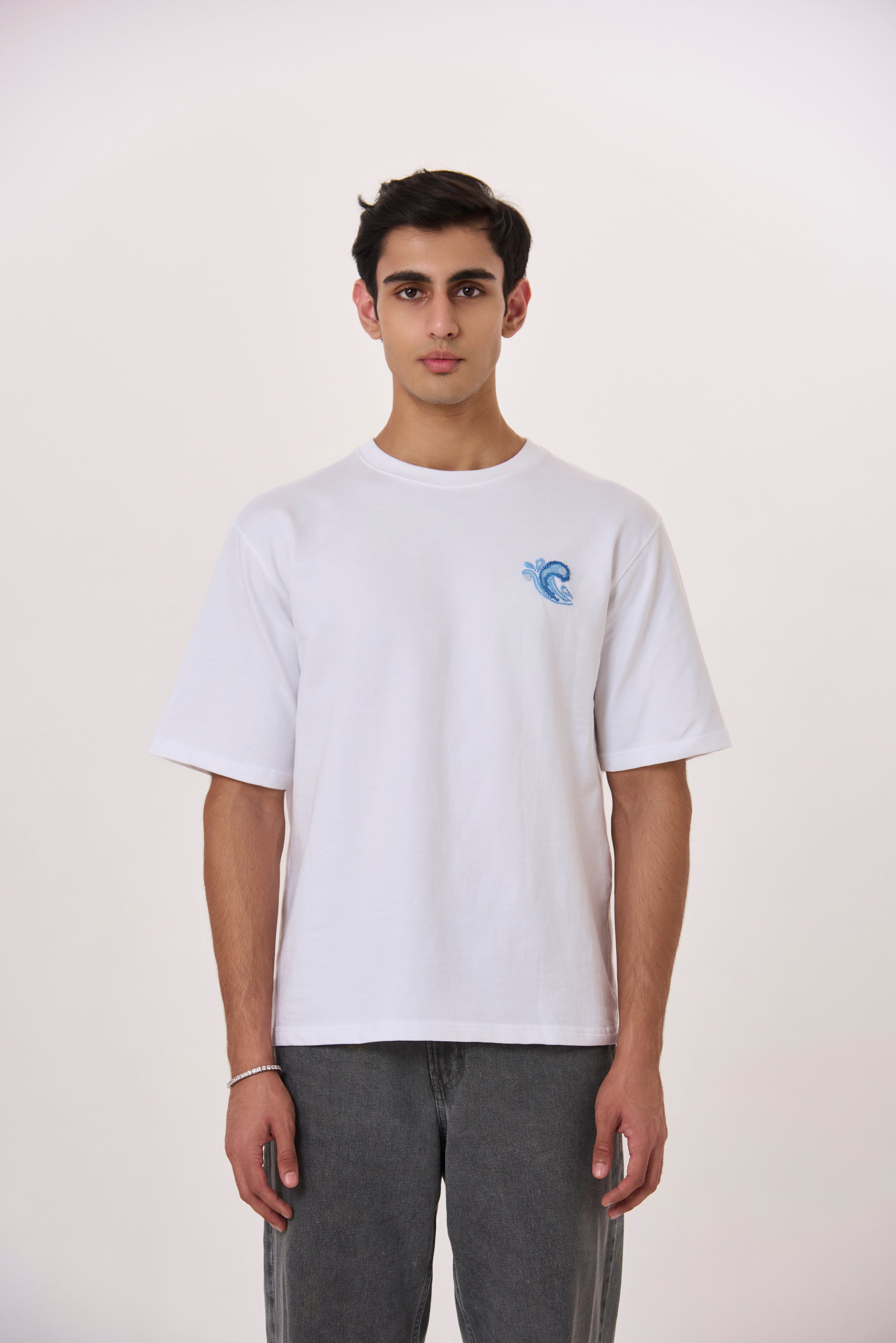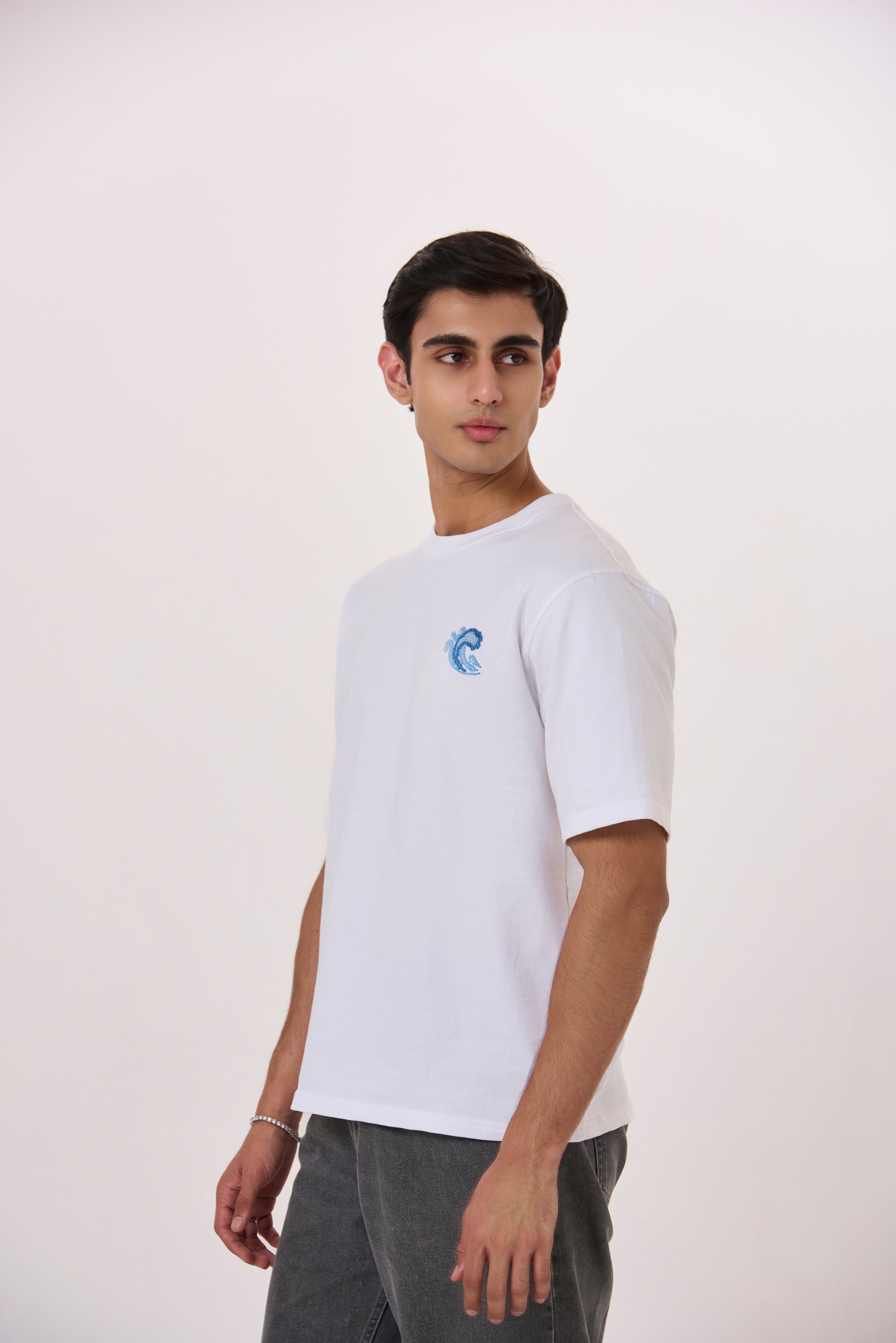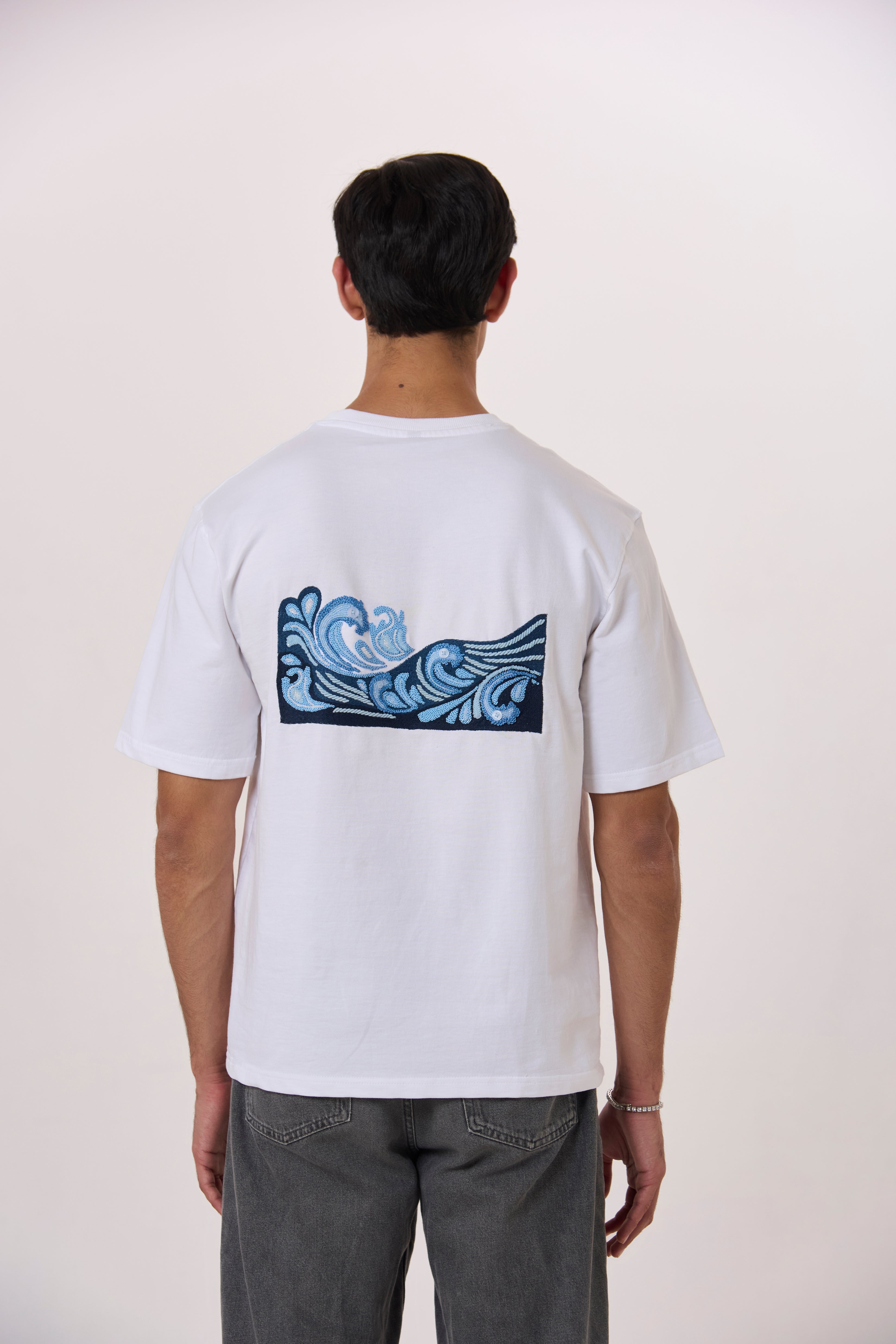 Our unisex relaxed fit cotton blend t-shirt fetaures meticulously crafted waves in the back and a complimenting emblem in the front with signature button detail, making it the ultimate luxury streetwear.