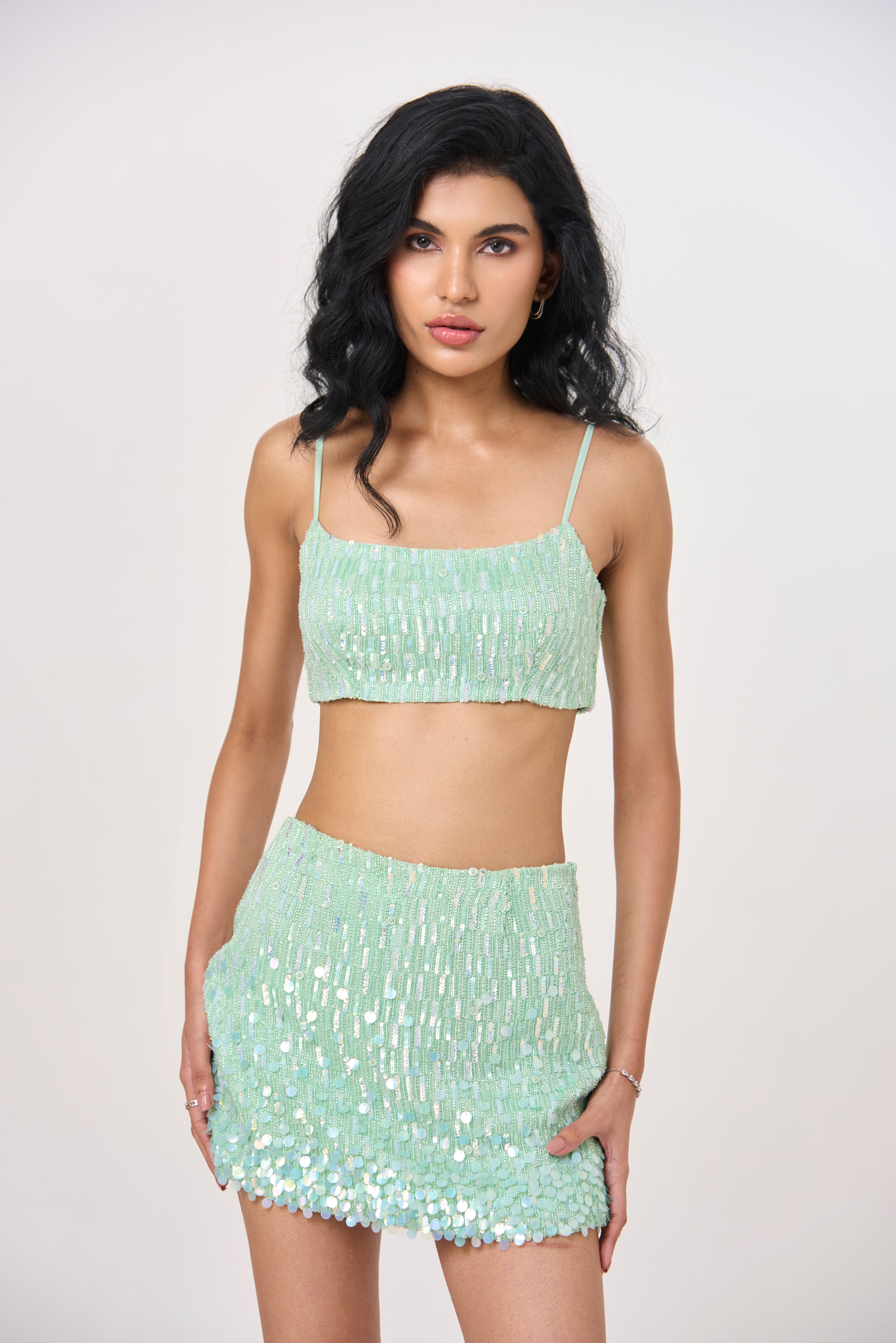 The Siren set is fully hand-embroidered with dense rows of beads, sequins and crystals, forming a textured surface that catches the light with every move. The cropped top features a sleek, body-hugging fit.