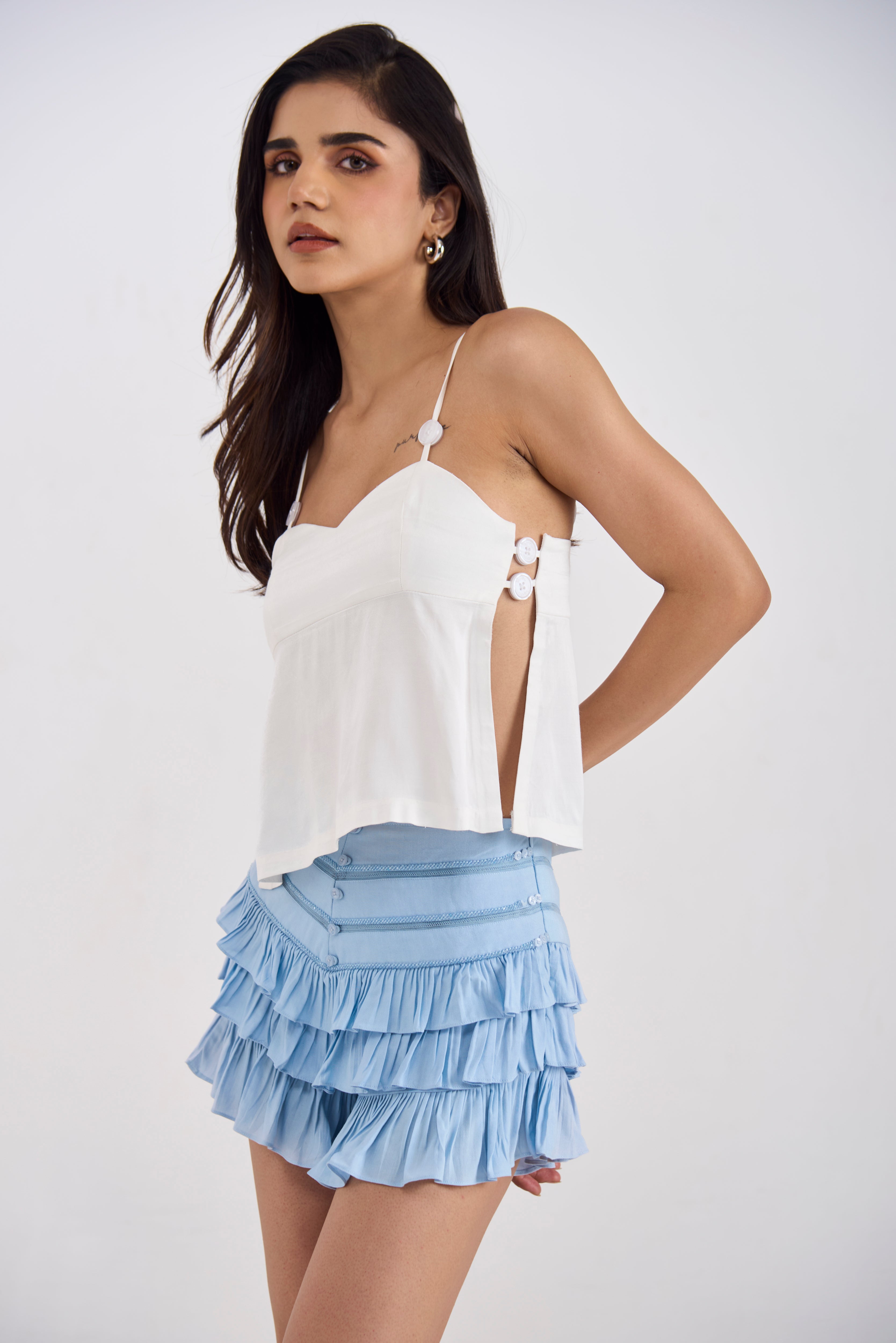 The Sunny top features a sleek silhouette elevated by our signature button accents on the straps and sides. The understated elegance and functional details create a sophisticated piece that seamlessly transitions from day to night.